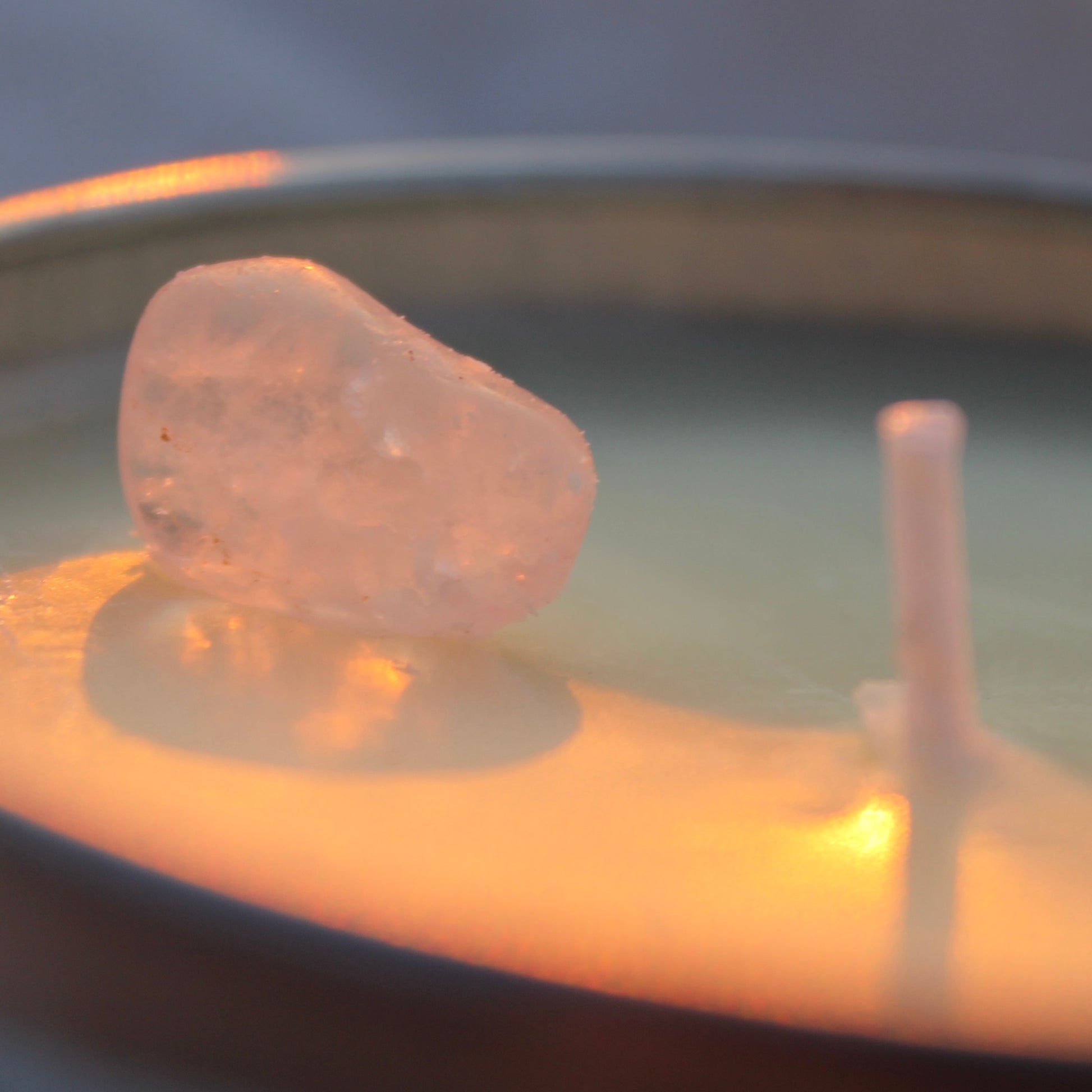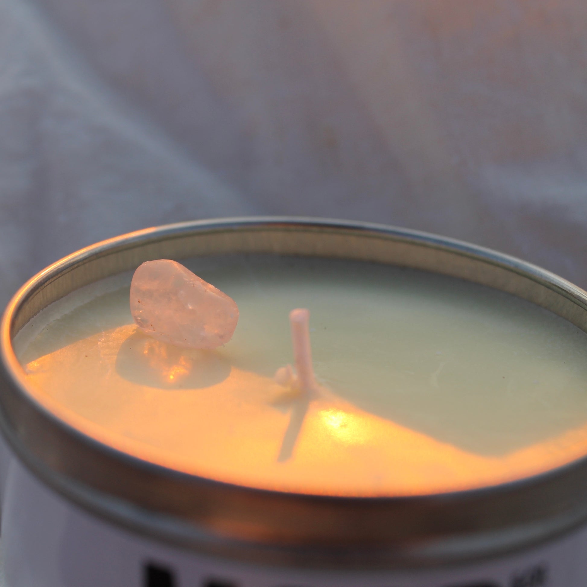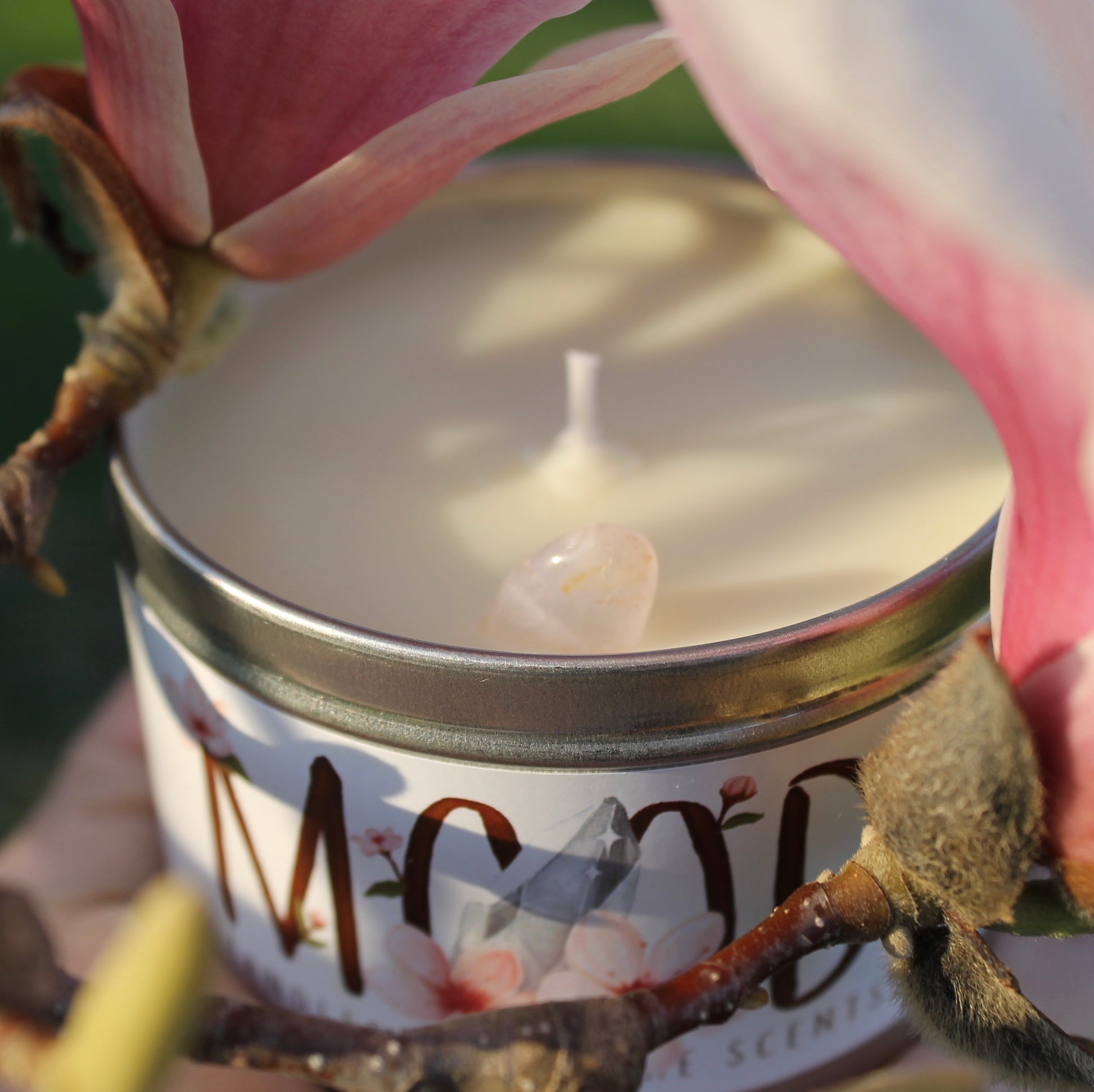 We've added the fair and lovely Rose Quartz crystal into each of the candles as well as bits and pieces of dried magnolia petals that were picked from the ground after falling down from the trees (which you will see when you received the candle.) The wick/flame, Rose Quartz inside the candle and crystal on the label has been carefully aligned when lit.